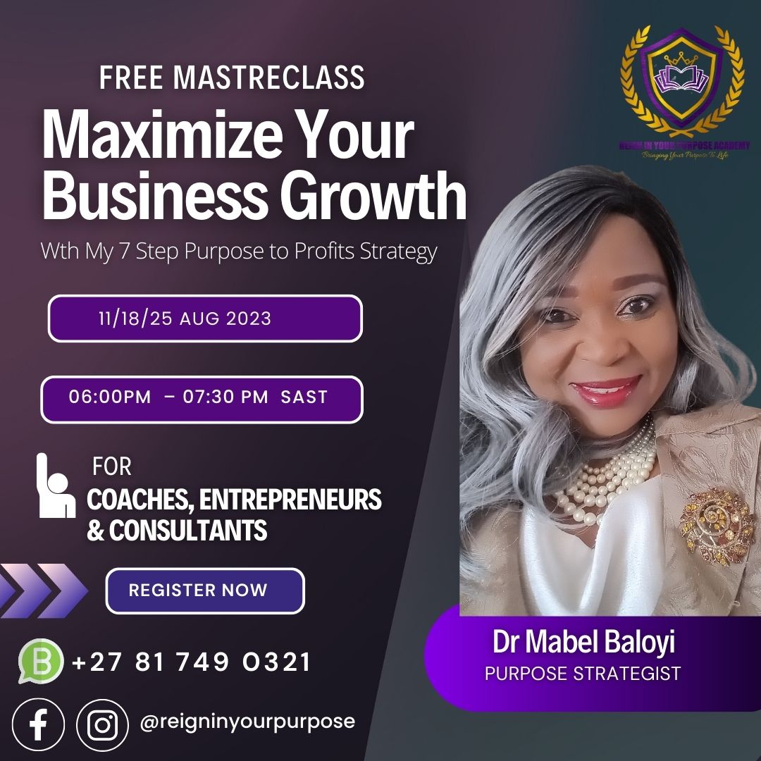 Enjoy the MAXIMIZE YOUR BUSINESS GROWTH WITH MY 7 STEP PURPOSE TO PROFIT STRATEGY MASTERCLASS.